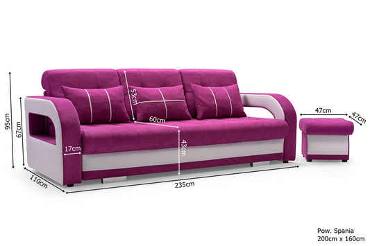NINA SOFA with PUFF, SLEEPING FUNCTION, STORAGE SPACE, VINE COLOUR with WHITE FAUX INSERT, VELVET LIKE - FAST DELIVERY >235 x 110 cm<