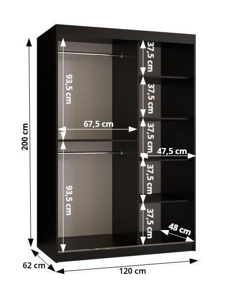 JAFITA - Slim Wardrobe 2 Sliding Doors Black with Mirror Shelves, Rails, Fast Delivery> 120cm <