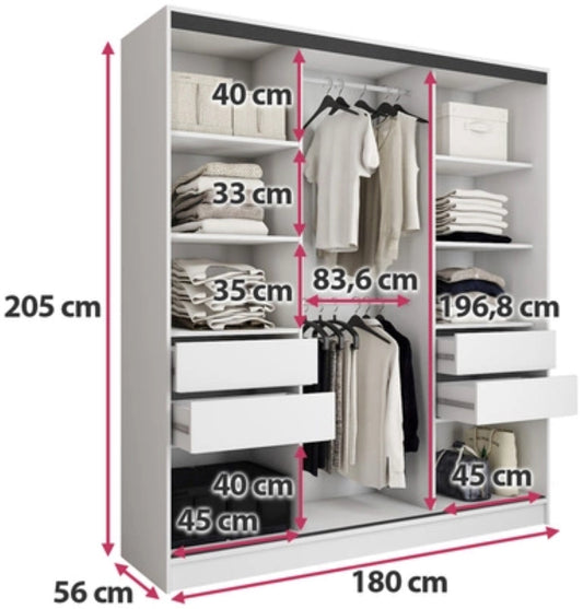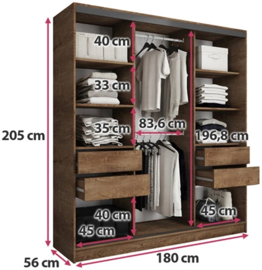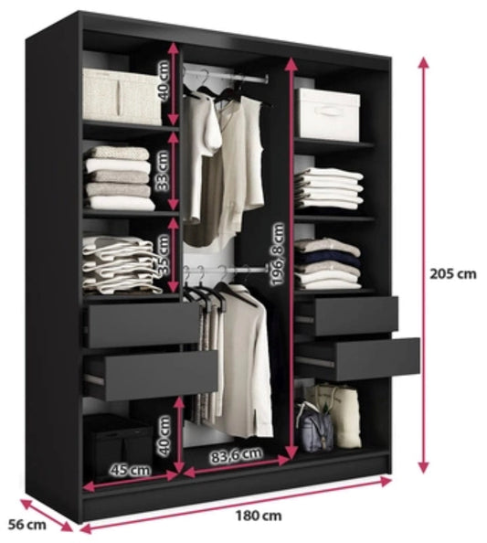 LOFT - 3 Sliding Doors Wardrobe With Drawers Shelves 2 Rail 2 Colours 180 cm