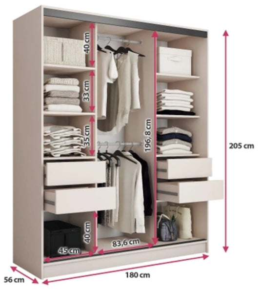LOFT with Mirror - 3 Sliding Doors Wardrobe With Drawers Shelves 2 Rail 3 Colours 180 cm