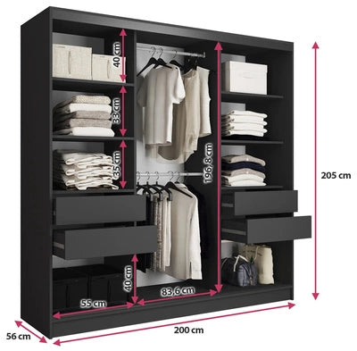 LOFT - 3 Sliding Doors Wardrobe With Drawers Shelves 2 Rail Black Body 3 Option 200 cm