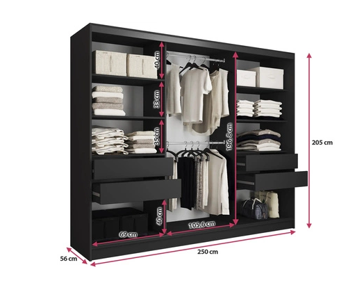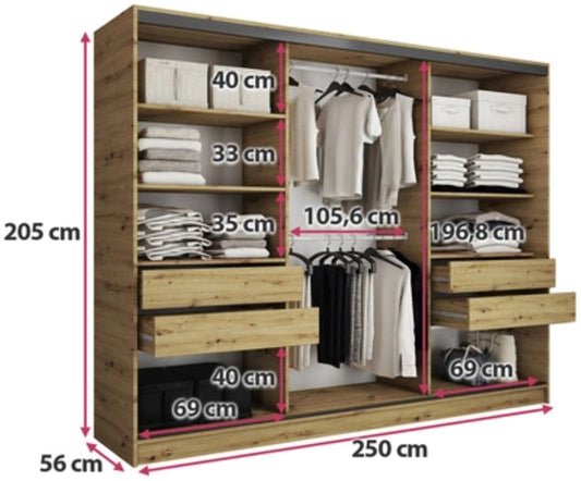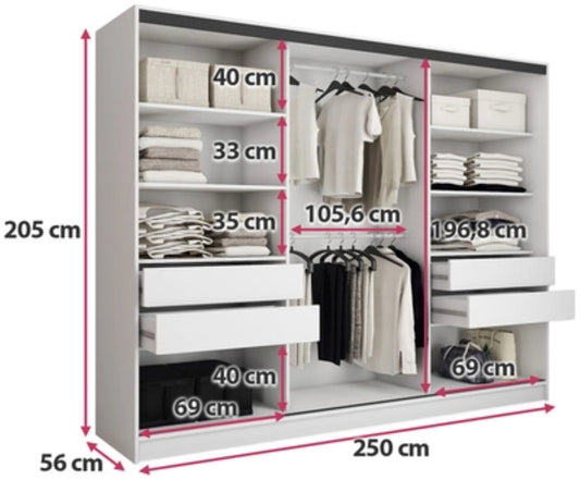 LOFT No Mirror - 3 Sliding Doors Wardrobe With Drawers Shelves 2 Rail Various Colour 250 cm